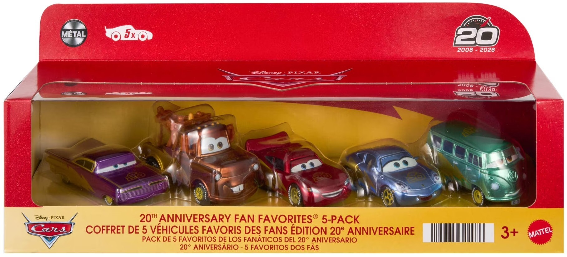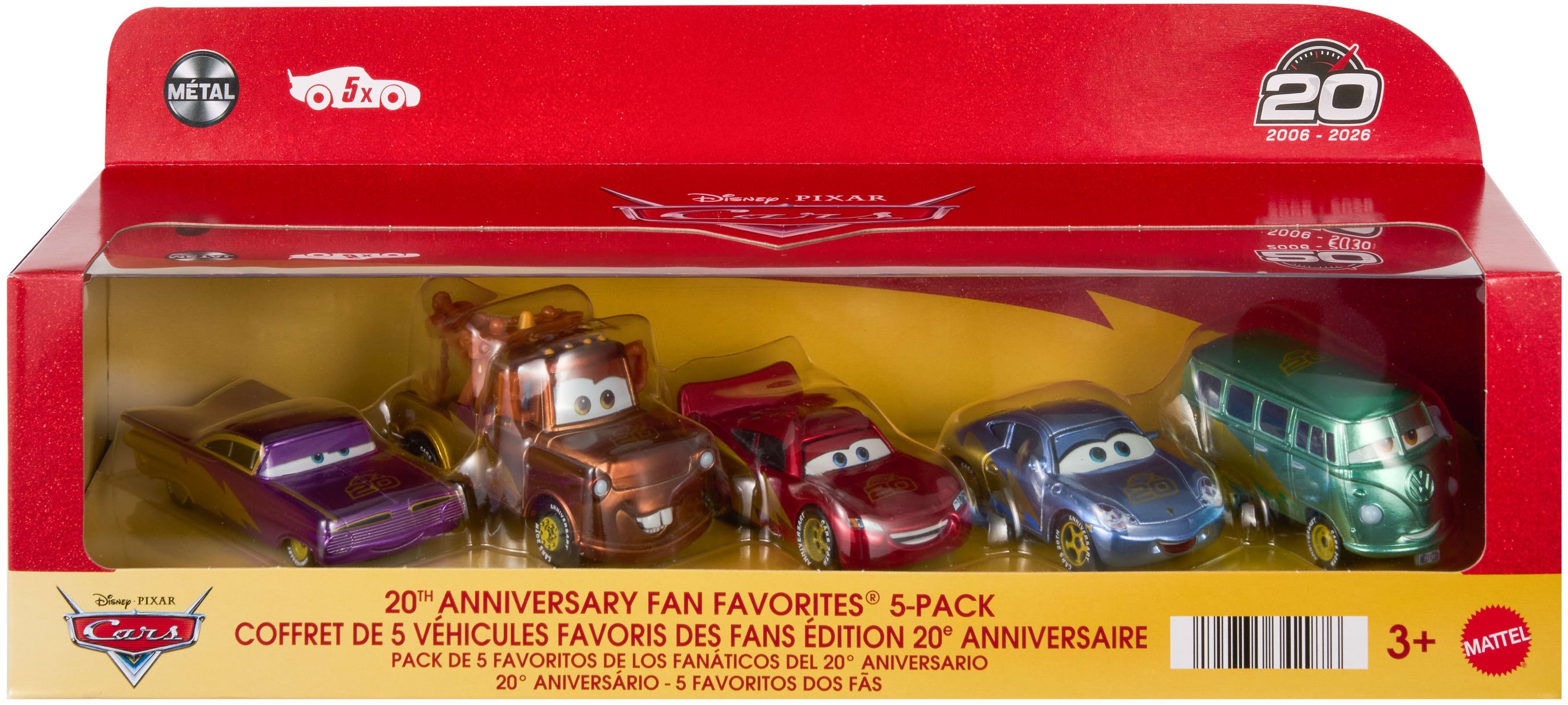 | Description | Disney•Pixar Cars: 20th Anniversary / 2006 - 2026 - Travelin' Team - 2026 boxed release Ramone / Ramón, Mater / Mate, Lightning McQueen / Flash McQueen / Rayo McQueen / Relâmpago McQueen, Sally, Fillmore 20th Anniversary Fan Favorites® 5-pack / Coffret de 5 Véhicules Favoris des Fans Édition 20e Anniversaire / Pack de 5 Favoritos de Los Fanáticos del 20° Aniversario / 20° Aniversário - 5 Favoritos dos Fās |