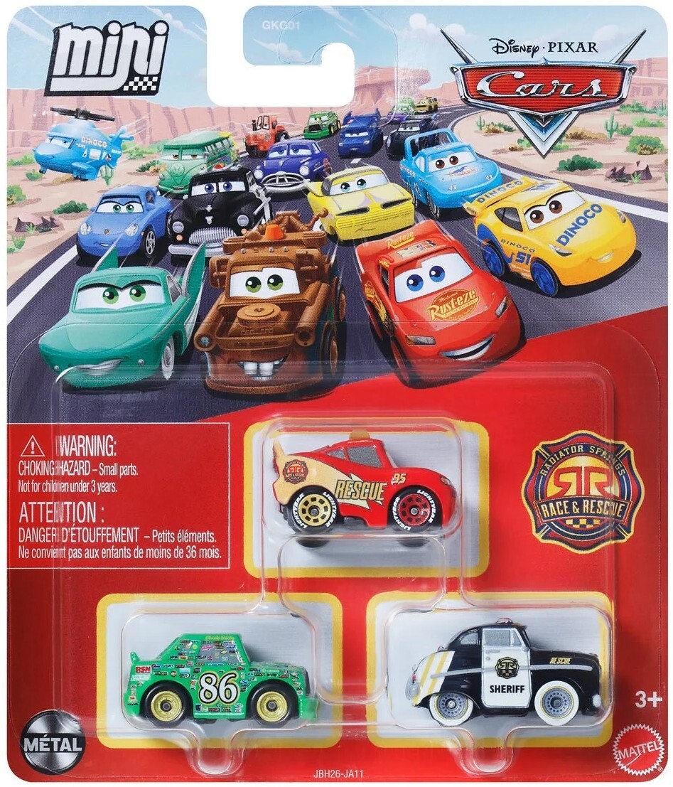 | Description | Disney•Pixar Cars: Mini - Radiator Springs: Race & Rescue - 2026 carded 3-pack release "Race To The Rescue 2" Chick Hicks, Lightning McQueen, & Sheriff |